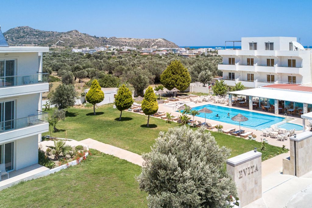 Direct naar: * Ligging () * Faciliteiten () * Restaurants & Bars () * Hotelkamers () * Sport & Ontspanning () * Zwembaden () * Verzorging () * Ligging: Evita Hotel * Op ca. 1 kilometer van het centrum van Faliraki * Op ca. 1,2 kilometer van het strand * Rhodos-Stad op ca. 14 kilometer * Bushalte op ca. 900 meter * Winkels, restaurants en bars op ca. 800 meter Faciliteiten * 2 gebouwen met 3 verdiepingen * Er zijn geen liften aanwezig * 62 kamers * Receptie * Kluisverhuur* bij de receptie * Bagageruimte * Lobby * Tuin * Wifi bij de receptie en het restaurant * Wasservice* * Privé parkeerterrein *Tegen betaling Restaurants & bars * 1 restaurant * 1 bar Hotelkamers * Standaardkamer (1-3 personen) * Ca. 23 m² * Airconditioning * Koelkastje * Wifi * Douche * Toilet * Föhn * Balkon of terras met zitje * Er zijn geen babybedjes aanwezig in het Evita Hotel * Premiumkamer (1-3 personen) * Ca. 25 m² * Dezelfde faciliteiten als de Standaardkamer * Televisie * Er zijn geen babybedjes aanwezig in het Evita Hotel * Familiekamer (1-4 personen) * Ca. 45 m² * Bestaat uit 2 ruimtes * Dezelfde faciliteiten als de Premiumkamer * Er zijn geen babybedjes aanwezig in het Evita Hotel Sport & Ontspanning * Watersporten aan het strand* *Tegen betaling Zwembaden & Strand * 1 buitenzwembad * 1 kinderbad * Zonneterras met gratis ligbedden, matrasjes en parasols * Gratis badhanddoekenservice * Ligbedden en parasols op het strand zijn tegen betaling Verzorging Zomer : Evita Hotel * Verblijf o.b.v. Logies & Ontbijt: ontbijt in buffetvorm * Tegen een meerprijs verblijf je o.b.v. Halfpension: Ontbijt in buffetvorm en diner is een set menu, bestaande uit: een salade, het hoofdgerecht van de dag en nagerecht. Extra informatie: Bij deze pakketreis is een huurauto inbegrepen, daarom vervalt de transfer van de luchthaven naar de accommodatie en vice versa. De reisleiding, aanwezig op de luchthaven, verwijst je naar het autoverhuurbedrijf en geeft je een welkomstenvelop. Is je reisgezelschap te groot voor één auto? Boek dan een tweede auto bij. Voor prijzen en beschikbaarheid kun je contact opnemen met ons Contact Center. Informatie & Voorwaarden Huurauto ()