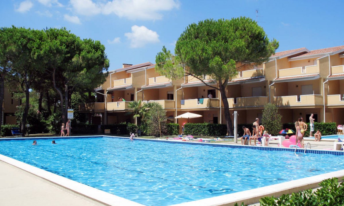 Vakantiepark Villaggio Selene in Bibione.64 comfortabele geschakelde appartementen. In een rustige omgeving op 300 m van het centrum. Zwembad met ligweide en privétuin.