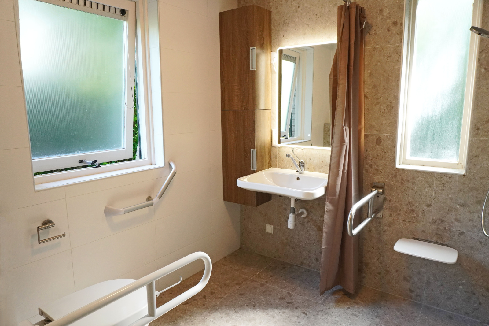 Deze moderne bungalow is speciaal ingericht voor meerdere families of groepen en rolstoelgebruikers. Genieten van een mooie omgeving met veel uitstapjes in het vooruitzicht? Dat kan in deze fijne omgeving. De woonkamer is ingericht met een zithoek, elektrische sfeerhaard en een televisie met Chromecast. De bungalow heeft een open keuken, compleet ingericht en met een sfeervolle eethoek. Op de begane grond bevinden zich twee slaapkamers en twee badkamers. Eén slaapkamer heeft een verhoogd bed. De aangepaste badkamer heeft een douche met een douchestoel met armleuningen, wastafel en toilet met beugels. De andere badkamer beschikt over een sunshower en een sauna.Op de eerste verdieping bevinden zich vier slaapkamers en een badkamer. De badkamer beschikt over een douche en wastafel. Daarnaast is er een apart toilet aanwezig.Buiten zijn er twee gemeubileerde terrassen waarvan één gedeeltelijk overdekt. Er zijn ook twee ligstoelen. Er is een verhard toegangspad naar en rondom de accommodatie en het terras is rolstoeltoegankelijk. Daarnaast heeft de bungalow vloerverwarming, een berging, wasmachine, traphekjes en zonnepanelen. Gebruik van wifi is gratis en er is parkeergelegenheid voor maximaal vier auto's bij de accommodatie. Daarnaast zijn er centrale parkeerplaatsen op het park.