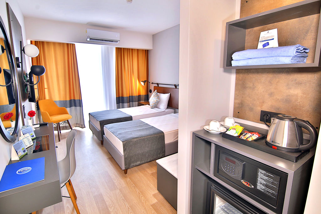 Zomer Wanneer je tussen 27-03-2026 en 07-11-2026 in deze accommodatie verblijft, is onderstaande informatie van toepassing. * Ligging * In het centrum van Alanya * Openbaar strand Kleopatra beach op circa 600 meter * Dichtstbijzijnde winkel op circa 20 meter * Dichtstbijzijnde restaurant op circa 20 meter * Shuttleservice naar het strand * Bushalte op circa 20 meter * Algemeen & faciliteiten * 1 gebouw * Maximaal 9 verdiepingen * 85 kamers * Receptie * 24 uur per dag * Lobby * 2 liften * Bagageruimte * Wifi in alle openbare ruimtes * Wasservice tegen betaling * Doktersservice tegen betaling * Openbare parkeergelegenheid * Restaurants & bars * Buffetrestaurant * Drinkgelegenheid * Poolbar * Activiteiten & ontspanning * Fitness * Spa Center * Binnenzwembad * Sauna tegen betaling * Hamam * Massages tegen betaling * Animatie * 2 keer per week * Shows * 2 keer per week * Zwembaden * Buitenzwembad * Buitenzwembad voor kinderen * Binnenzwembad * Zonneterras * Ligbedden * Parasol * Badhanddoekenservice * Verzorging * All Inclusive * Ontbijt in buffetvorm (07.30-09.30 uur) * Laat ontbijt in buffetvorm (09.30-10.00 uur) * Lunch in buffetvorm (12.30-14.00 uur) * Diner in buffetvorm (18.30-20.30 uur) * Koffie, thee & koekjes (16.00-17.00 uur) * Selectie lokale (non-)alcoholische drankjes (10.00-00.00 uur) * Tegen betaling: IJs, import drankjes, turkse koffie en verse vruchtensappenHotelkamers * 2-persoonskamer Standaard DZ * Oppervlakte van circa 23 m² * Airconditioning * Kluisje tegen betaling * Televisie * Telefoon tegen betaling * Eet- en drinkfaciliteiten * Koffie- en theefaciliteiten * Minibar * Gevuld met water * Badkamer douche, toilet en föhn * Wifi * Balkon (zitje)